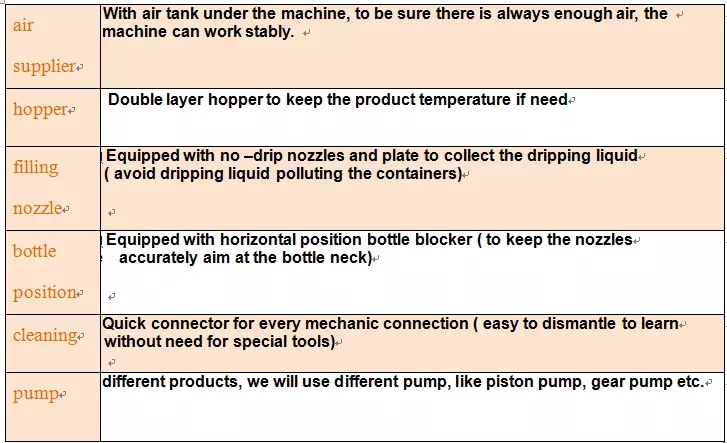 Ta stroj je posebej izdelan za vse vrste viskoznosti / tekočine v prehrambeni industriji, kemični industriji in surovinah, kot so motorno olje, motorno olje, solata, gel za pranje rok, kokosovo olje, sojina omaka, sezam, šampon, tekoče milo, motorno olje , zavorno olje, olje za kuhanje, paradižnikova omaka, pijača, eterično olje, rastlinsko olje, med, poprova omaka, arašidovo maslo, jogurt, sok, pijača itd. Ves del stika s tekočino / omako je visoko kakovostno nerjavno jeklo. Stroj sprejme batno črpalko za polnjenje. Če prilagodite položaj črpalke, lahko napolni vse steklenice v enem polnilnem stroju, s hitro hitrostjo in visoko natančnostjo.